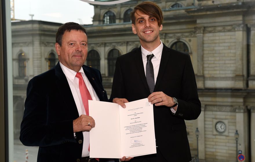 Die Hamburgische Wissenschaftliche Stiftung hat zusammen mit der Edmund Siemers-Stiftung zum dritten Mal den mit 10.000 Euro dotierten Werner-von-Melle-Preis verliehen. Der Vorsitzende des Kuratoriums der Stiftung, Dr. Ekkehard Nümann, überreichte am 27. Oktober dem Philosophen Dr. Julian F. Müller den Preis im Rahmen einer Festveranstaltung in der Handelskammer.