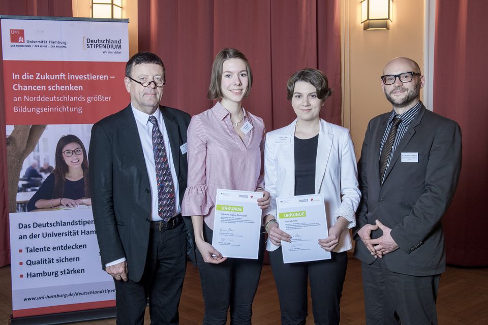 Mit dem Deutschlandstipendium werden besonders leistungsstarke Studierende mit 300 Euro pro Monat gefördert. Es wird je zu Hälfte von der Bundesregierung und privaten Geldgebern finanziert und von der Universität vergeben. Die Hamburgische Wissenschaftliche Stiftung stellt die finanziellen Mittel für insgesamt drei Stipendien bereit, darunter die beiden Neustipendiatinnen.