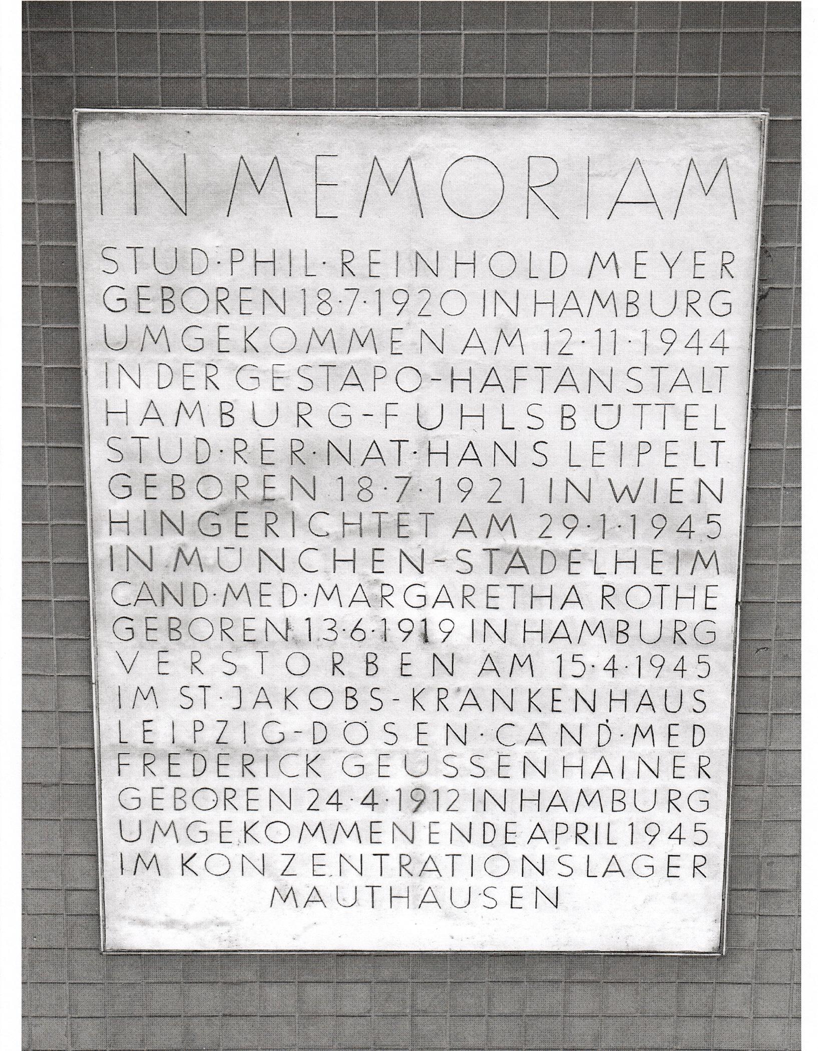Eine Gedenktafel im Foyer des Auditorium Maximum und vier "Stolpersteine" vor dem Hauptgebäude der Universität Hamburg in der Edmund-Siemers-Allee erinnern an die Studierenden Hans Leipelt, Reinhold Meyer, Margaretha Rothe und Friedrich Geussenhainer. Anlässlich des 100. Geburtstags von Hans Leipelt am 18. Juli 2021 hat die Hamburgische Wissenschaftliche Stiftung die Publikation Weiße Rose Hamburg. Drei Reden zum Widerstand im Nationalsozialismus vorgelegt.